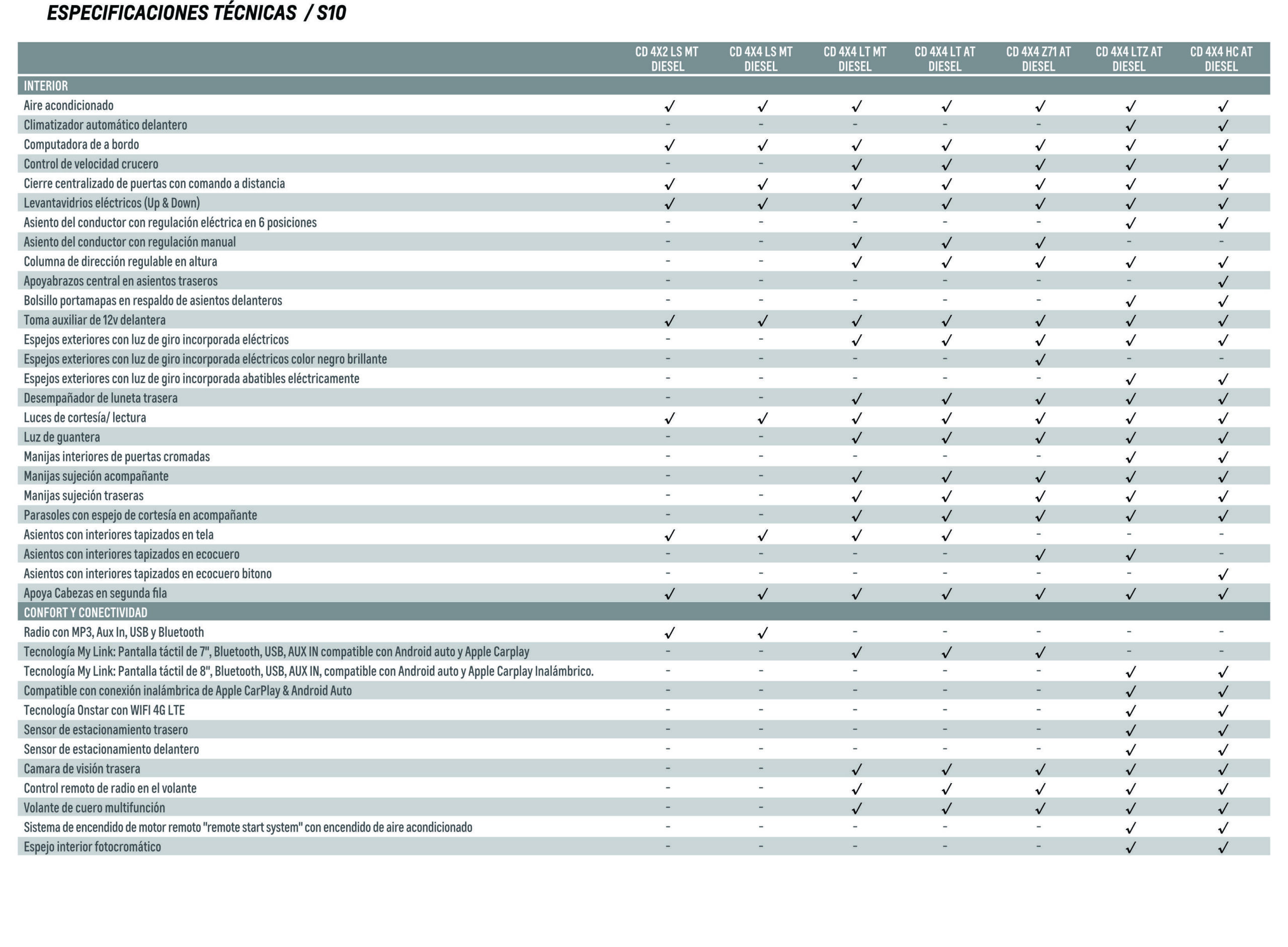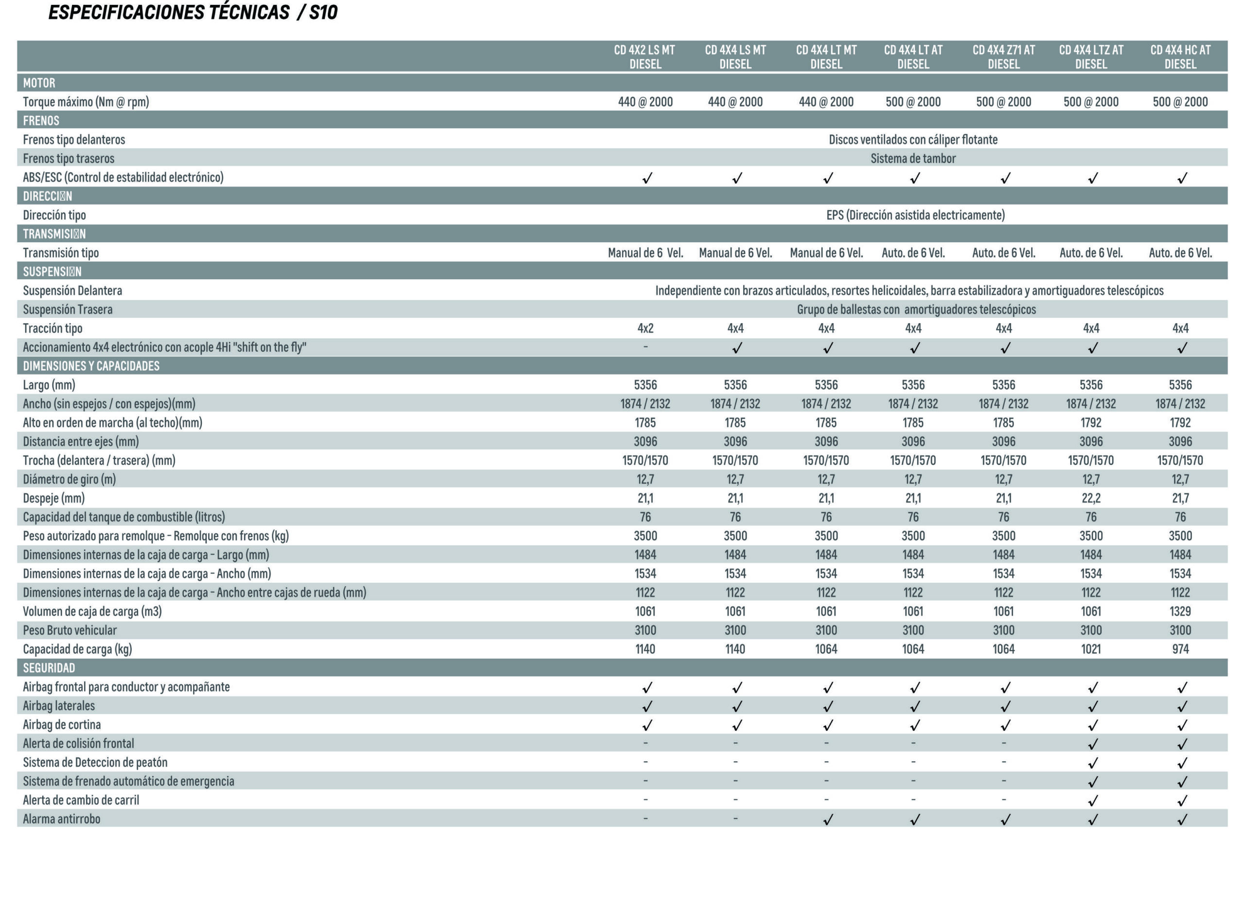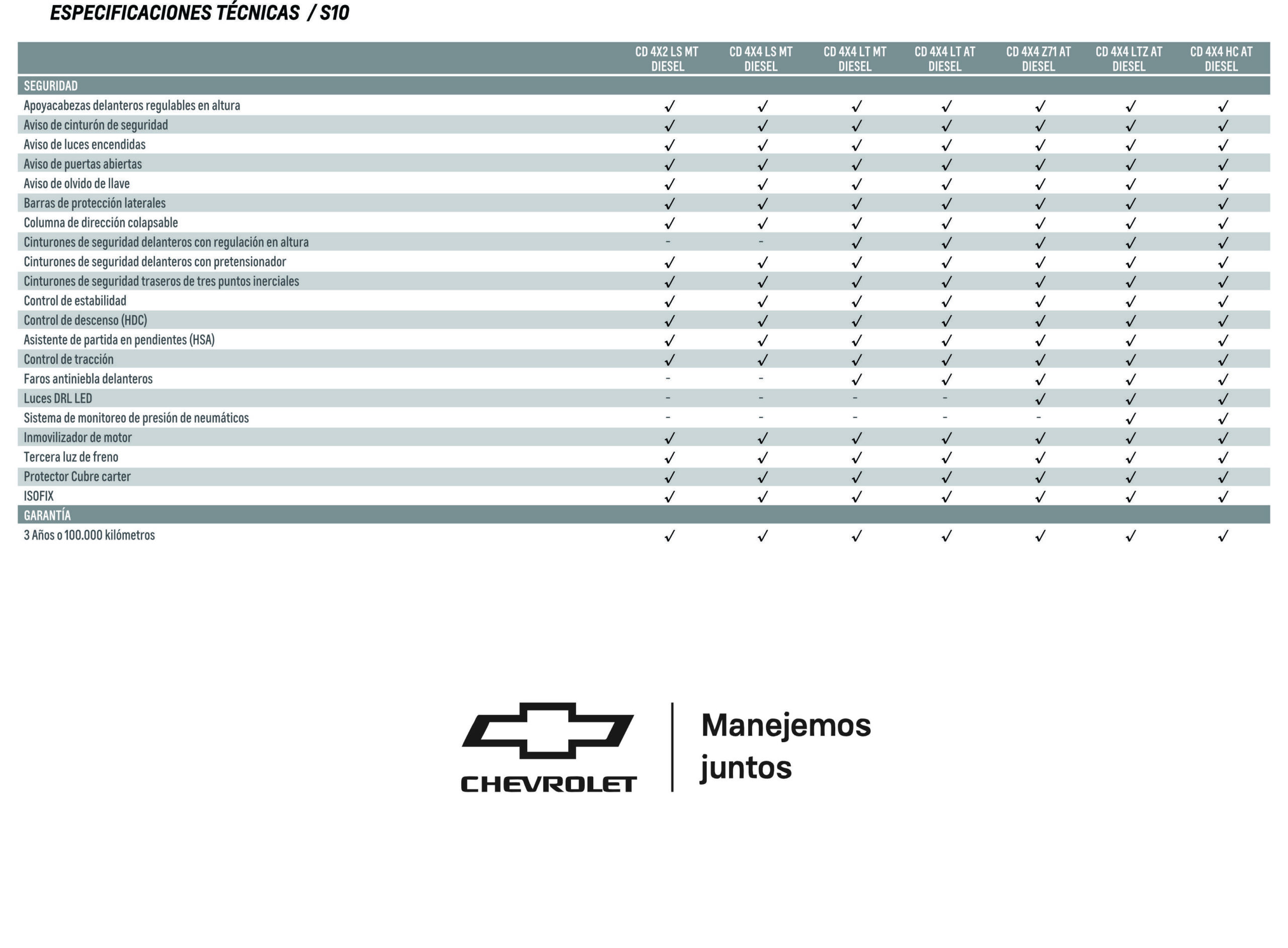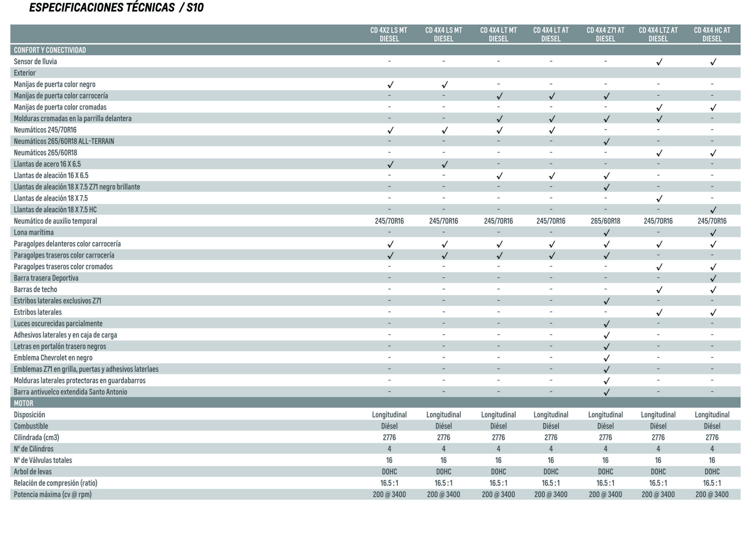 S10 Características Versiones HC HC HC HC LTZ LTZ LTZ LTZ Z71 Z71 Z71 Z71 No hay duda: la S10 es la camioneta ideal para ti ¡La S10, ofrece comodidad, seguridad, tecnología y fuerza para superar cualquier desafío!